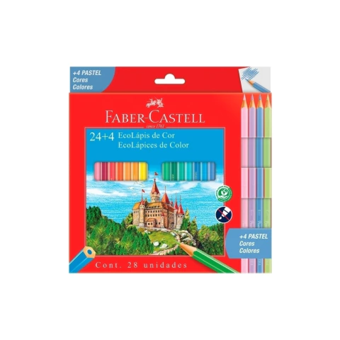 Deixe a criatividade fluir com os Ecolápis de Cor 24 Cores + 4 Tons Pastel da Faber-Castell. Seus desenhos mais vivos e criativos com ótima cobertura. O formato do Ecolápis é sextavado e sua formulação exclusiva garante a durabilidade do produto. Produzido com madeira 100% reflorestada e certificada pelo FSC: respeito ao meio ambiente.